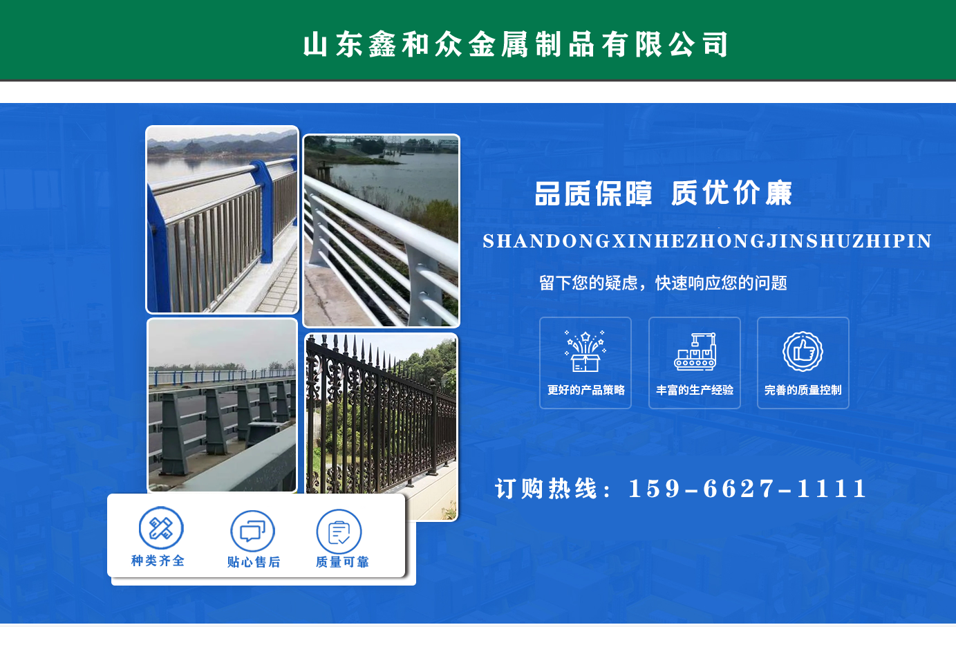 山東鑫和眾金屬制品有限公司主要產(chǎn)品有防撞護(hù)欄,橋梁護(hù)欄,道路護(hù)欄,河道護(hù)欄,不銹鋼護(hù)欄等護(hù)欄。提供設(shè)計方案,一站式定制,包您滿意價格優(yōu)惠,歡迎來電咨詢! 公司常年從事銷售護(hù)欄防撞護(hù)欄,橋梁護(hù)欄,道路護(hù)欄,河道護(hù)欄,不銹鋼護(hù)欄,橋梁鋼護(hù)欄,河道燈光護(hù)欄等。產(chǎn)品廣泛應(yīng)用于橋梁、河道、旅游景區(qū)、道路、公路、公園、小區(qū)、景觀、道路防撞等領(lǐng)域?! 」井a(chǎn)品均采用優(yōu)質(zhì)不銹鋼材料,符合相關(guān)標(biāo)準(zhǔn)。各種型號不銹鋼復(fù)合管及護(hù)欄,質(zhì)量嚴(yán)格把控。產(chǎn)品強度高、耐腐蝕、焊接牢固、抗沖擊、性能好,防撞護(hù)欄結(jié)構(gòu)簡單、美觀實用大方。 歡迎前來訂購!...